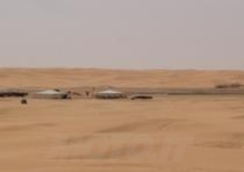 Soffia un vento forte e laterale che trasporta la sabbia sull’asfalto, facendolo a tratti quasi scomparire. Le raffiche cariche di sabbia ci investono e, nonostante l’attrezzatura completa, sento i granelli di sabbia aggredire ed infiltrarsi in ogni minima fessura dell’abbigliamento, graffiare le palpebre che tentano di proteggere gli occhi, insinuarsi nel naso e sentirla sotto i denti pur non avendo aperto mai bocca. La luce è stranissima. Forse è un giorno particolare oppure è la sabbia che da all’atmosfera quel colore giallastro ma poco luminoso. Sembra un paesaggio marziano! Tutto questo non riduce minimamente quell’emozione incredibile che mi assale quando lasciamo quell’appena visibile lingua d’asfalto, per introdurci inesorabilmente nelle viscere del deserto! Ancora qualche casa, se così possono definirsi quelle costruzioni di paglia adagiata su dei muretti bassi che gli indigeni usano come abitazione, e si apre davanti ai nostri occhi lo spettacolo della distesa infinita di sabbia mista ancora a qualche ciuffo di vegetazione che sia accontenta di pochissime gocce d’acqua all’anno per sopravvivere.