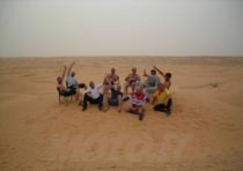 La stanchezza, unita alla deconcentrazione, può giocare brutti scherzi. Non a caso, statisticamente sono proprio le ultime giornate di un moto raid come questo, a registrare gli incidenti più seri. Per fortuna, nel nostro caso, l’unico inconveniente è stato una interpretazione non unanime dell’ultimo tratto di strada che ci ha fatto giungere a Douz con qualche ora di ritardo, ma tutti sani e salvi. E’ ormai l’imbrunire quando improvvisamente, forse perché non ci si voleva illudere ancora, appare la sagoma dell’albergo alla fine di un trasferimento in asfalto sembrato interminabile. E’ un momento straordinario: ci sentivamo davvero degli eroi! E finalmente potevo pensarlo a mente serena, consapevole di poter finalmente allentare la tensione, ma con un piccolo dispiacere che già si affacciava nel cuore nonostante fossi stremato: realizzare che questa avventura unica e straordinaria era finita. Ci stringiamo le mani, ci abbracciamo, ci scambiamo pacche sulle spalle e sui serbatoi delle moto. C’è una certa emozione mentre allineiamo le moto per le foto di rito.
