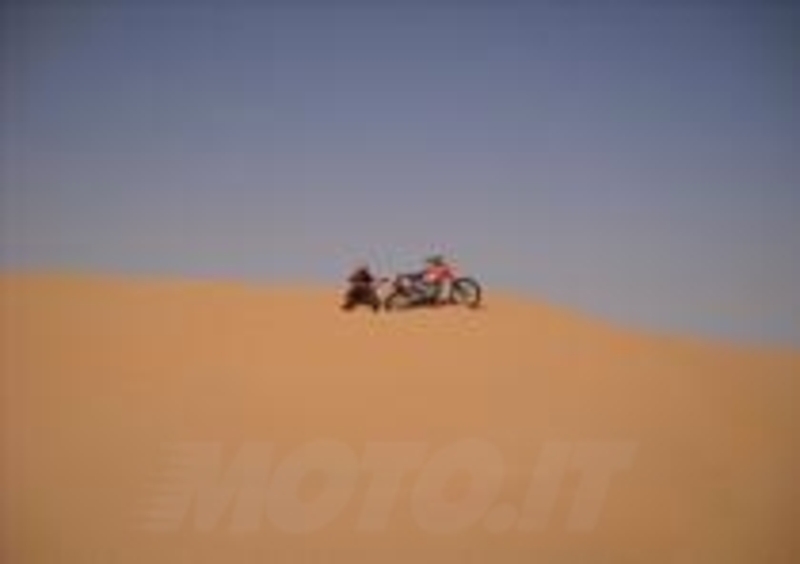 Chilometri e chilometri sulle dune ci hanno conferito una notevole sicurezza di guida sulla sabbia, ma questo non ci mette al riparo da frequenti cadute (chi più chi meno…), fortunatamente senza gravi conseguenze per noi e le moto. Il salto della dunetta diventa una pratica continua e scontata; divertente, ma…certe volte non finiscono davvero mai!! E gli ultimi giorni se ne ha quasi la nausea… Ma personalmente (e non credo di essere il solo…) il momento più emozionante dell’attraversamento del deserto, è l’avvistamento all’orizzonte di immensi cordoni di dune; imponenti, alte ma a portata di moto, pulite, che sembrano aspettare solo le ruote di chi ha il coraggio di sfidarne la pendenza. Qualche fugace occhiata verso chi suppongo possa avere le mie stesse intenzioni (Benni, il colonnello, Ciccitto, Michele e col passare dei minuti anche gli altri) e via col gas a martello verso l’ascesa mozzafiato della duna!!