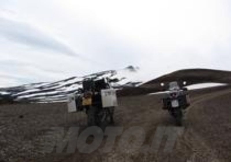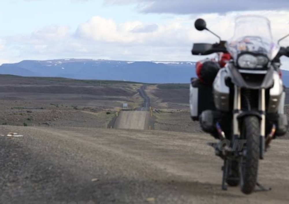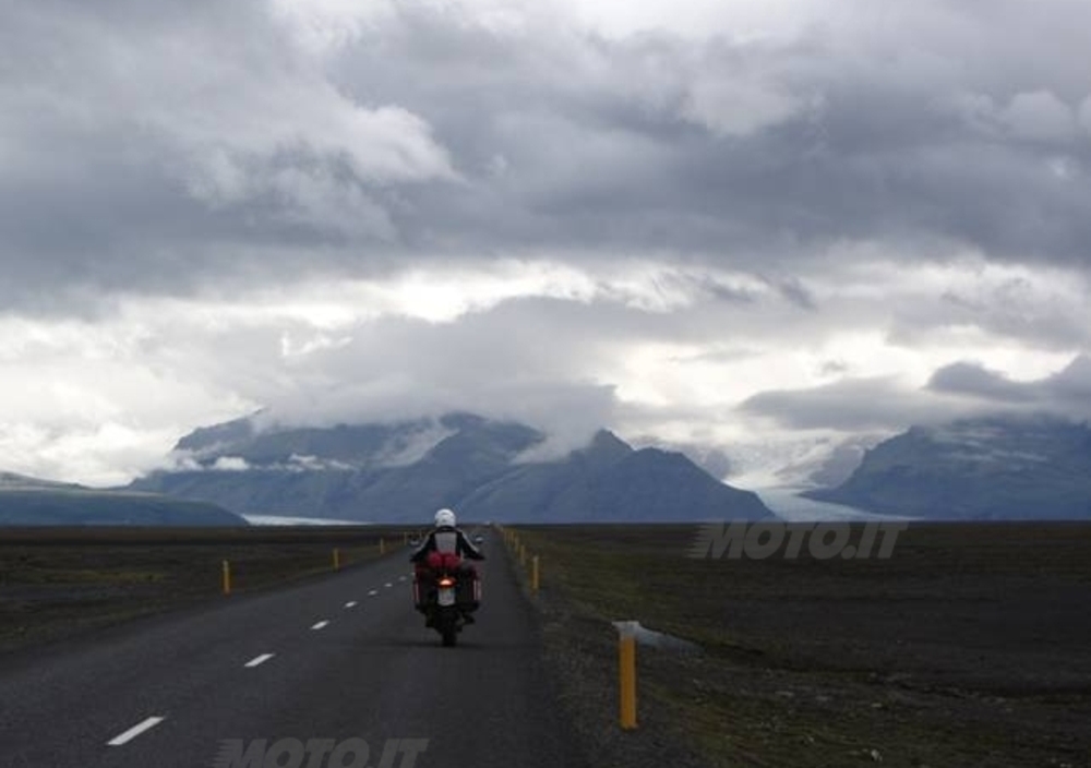 Ci salutiamo allegramente, indugiando tutti ancora un poco, come se nessuno avesse il coraggio di partire per primo. Salutiamo i due di Torino. Salutiamo la coppia fresca di matrimonio, lei pimpante e radiosa come fosse appena scesa dall’altare, lui con il viso dello stesso colore giallo del Gs 1150 dell’altra coppia. Salutiamo anche loro. Non vedo i K spaziali, ma non mi importa. Marco, Pietro, Emanuele ed io ci immettiamo sulla n°1, l’unica strada completamente asfaltata di tutta l’Islanda, ma per poco. Leggendo e studiando le carte e gli itinerari nelle ore di attesa sul traghetto, avevamo individuato un percorso che ne tagliava via un gran pezzo, una specie di scorciatoia, così già dopo pochi chilometri ci buttiamo sulla 901 e, come Alice attraverso lo specchio, entriamo in un'altra dimensione. Il mare blu e verde, che ci ha cullato per due giorni, scompare, come se non fosse mai esistito. Ne appare un altro, coi toni di marrone e ocra, Il paesaggio è davvero sconfinato. Monti innevati all’orizzonte. La strada, attraverso una piana immensa, svanisce nel nulla, laggiù in fondo, sul bordo superiore di colline scure, che segnano il confine tra il cielo e la terra.