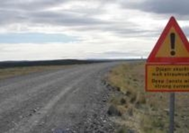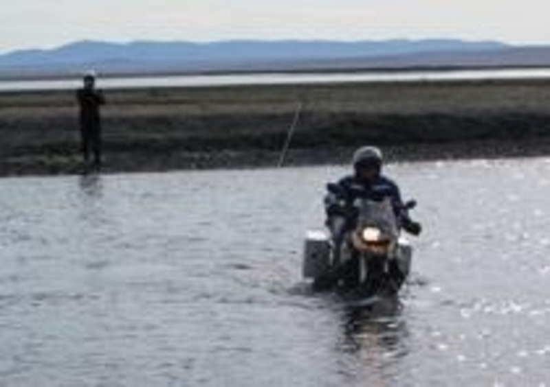 Negli uffici del turismo è in distribuzione gratuita un piccolissimo opuscolo con le istruzioni per l’attraversamento dei guadi, le stesse istruzioni in più lingue, sono presenti anche su dei cartelli posti sulle sponde dei corsi d’acqua più estesi. La prima raccomandazione è di attraversarli, se possibile, la mattina presto, quando il freddo della notte ha rallentato lo scioglimento del ghiaccio e della neve, riducendo quindi la portata d’acqua. Questo consiglio me lo diede anche Patric, sul traghetto all’andata. Nella sua prima esperienza con la 208, dopo aver superato alcuni guadi, si fermò per mangiare e fare foto in una valle senza rendersi conto dello scorrere del tempo. Quando ripartì, al primo guado successivo, si trovò davanti ad un torrente impetuoso, impossibile da attraversare in moto. Decise così di tornare indietro, ma anche uno dei corsi d’acqua, attraversati agevolmente la mattina, si era trasformato, a sua volta, in un torrente impetuoso, sbarrandogli la strada. Fu costretto a piantare la tenda e trascorrere la notte sul posto, e solo la mattina seguente, di buon’ora, riuscì a proseguire.