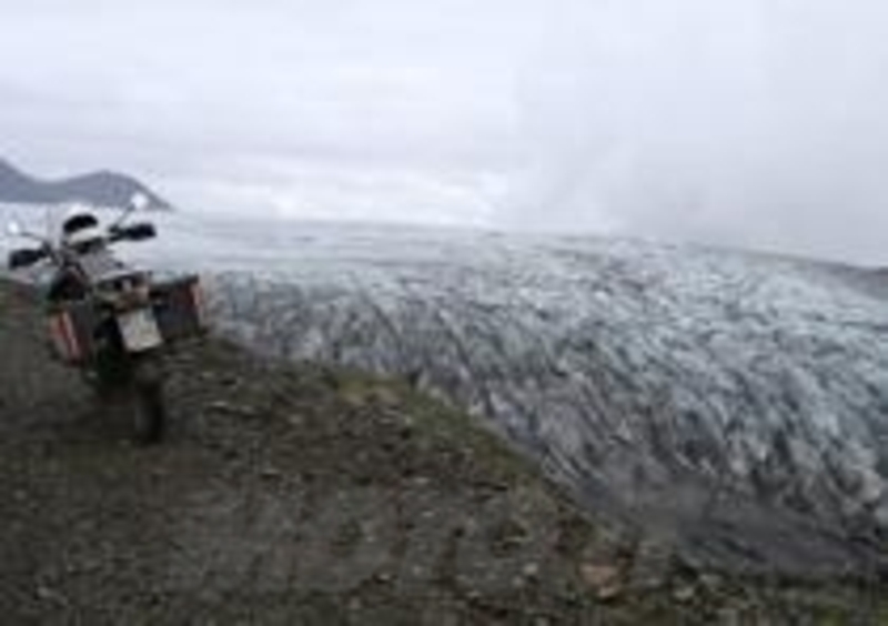 Ormai non ci stupisce più arrivare ad Olafsvik ed accorgerci che chiamarlo paese è una esagerazione bella e buona, ma il distributore almeno c’è, solito rabbocco e via. Raggi di sole filtrano tra le nuvole quando imbocchiamo la pista che porta verso la cima dello Snaefellsjokull. Procediamo su di uno sterrato che diventa sempre più impegnativo, le pietre che spuntano dalla superficie della mulattiera sono sempre più grosse e la strada sempre più ripida, io che viaggio con gomme stradali accuso il colpo e procedo a grande fatica, fino a che proprio non riesco più ad avanzare. La ruota posteriore gira, grattando i sassi, ma l’anteriore non si sposta che di pochi centimetri. Mi fermo. Marco, gommato meglio di me, riesce a salire ancora e scompare nelle nuvole che si stanno abbassando rapide su di noi. Tornerà dopo poco per comunicarmi che non si va oltre, ad un paio di chilometri la strada è invasa dalla neve. Ci giriamo. Abbiamo da poco iniziata la discesa che incrociamo un uomo, il quale, scarponi da montagna e zaino, sta salendo a piedi. Questo è un altro dei giochi di prestigio che questa terra è capace di fare: percorri decine, se non centinaia, di chilometri senza incontrare anima viva e poi all’improvviso ti appare, come sbucato dal nulla, qualcuno che vaga, attraversa, esplora, la magia di quest’isola, spesso nella più completa solitudine. Mi torna in mente Patric, il parigino compagno di cabina. Chissà dove avrà abbandonato la moto ora. Chissà su quale vulcano ghiacciato si starà arrampicando in questo momento.