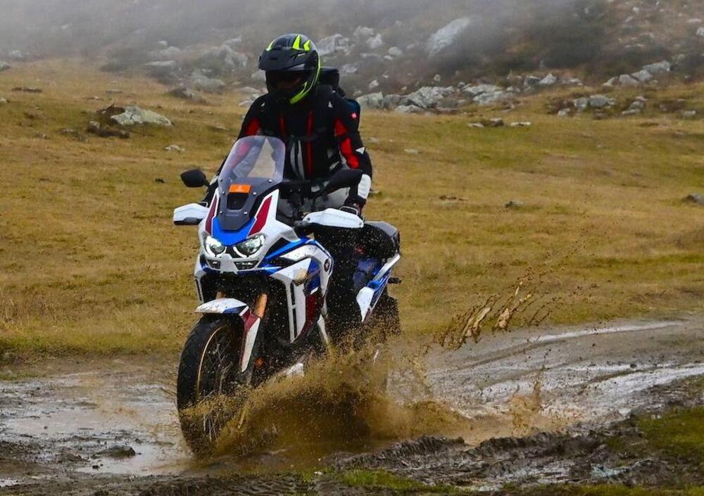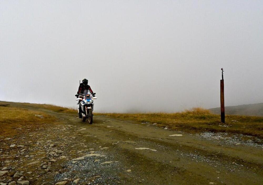 Siamo tutti guidati dalla passione e voglia di vivere l’avventura, la strada è sempre più ripida, anche senza tassellati con un filo di gas saliamo fluidi e felici, il bicilindrico Honda è sempre un portento, le nuvole basse in alcuni punti ci privano della vista quasi per farci immaginare ciò che vogliamo, ancora pochi chilometri e raggiungiamo il Santuario Madonna degli Angeli a 1888 metri, dove in un angolo della costruzione trova posto l’unica fontana che nei climi estivi può tornare molto utile per refrigerarsi e idratarsi.