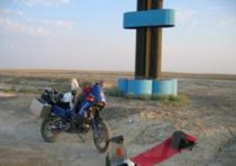 L’ingresso in Kazakhstan e’ strano. Prima mi fanno fretta, poi mi dicono che e’ chiuso per pausa pranzo. Vabbe’. Poi la guardia mi chiede denaro, io faccio il fesso, ma non gli do’ una lira. A causa di cio’ mi passera’ una macchina avanti, ma va bene cosi’. Dei bimbi vendono acqua, io seppur contrario al lavoro minorile, ho sete e gli compro due bottiglie. Fa caldissimo. Una bottiglia (due litri) la finiro’ prima di ripartire. Incontro degli Australiani in moto diretti in Francia da Vladivostock che si vedono costretti a ritornare indietro in Kazakhstan per fare regjstrazja (la registrazione di pernottamento presso Hotel o similari) in quanto avendo campeggiato, non la hanno mai richiesta (e ottenuta). Entro in KZ, cambio i dollari in Tenge (la moneta locale) e riparto. La strada e’ un po’ dissestata ma accettabile (piu’ o meno come in Russia) ma via via migliora. “Strani ‘sti Australiani, mi avevano detto che peggiorava progressivamente, invece sembra migliorare,” medito. Mi ricordero’ di questo pensiero di li’ a poco. Arrivando ad Atyrau (la prima citta’ dopo il confine) la via e’ addirittura una autostrada liscia e bella come non avevo visto da migliaia di Km (siamo gia’ a 3000).